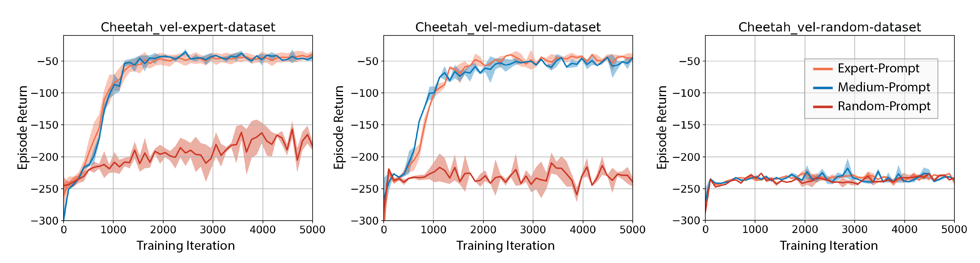 In practice, there may exist a limited amount of high-quality demonstrations for each test task, or the demonstrations may contain trajectories with heterogeneous quality. Our experiments show that, with trajectory prompt sampled from expert demonstrations and expert training dataset, Prompt-DT is not sensitive to the prompt quantity and can successfully extract task-specific information even with prompts containing only a few timesteps. We conduct an ablation study in Cheetah-vel for prompt quality. We find that Prompt-DT could adjust its generated actions according to the given trajectory prompt when training with expert data or medium data. However, when training with random data, only feeding Prompt-DT expert or medium trajectory prompts does not help improve the generalization ability.