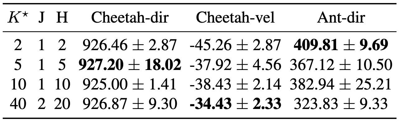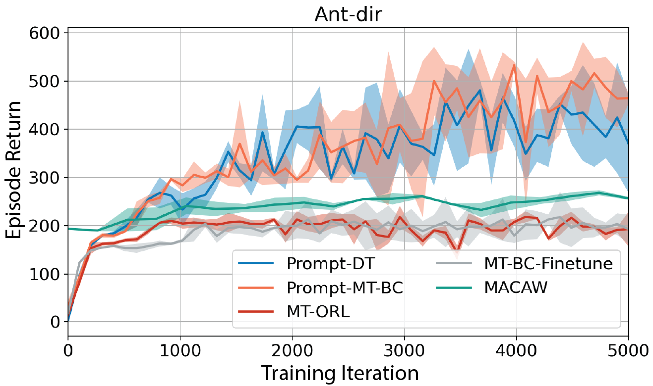 We desire to test whether trajectory prompts enable the extrapolation ability when handling tasks with goals out of the training ranges. We sample 8 training tasks in Ant-dir and 3 testing tasks, two of which have indexes smaller than the minimum task index and one larger than the maximum. The task index is proportional to the desired direction angle. We find that Prompt-DT still performs better than baselines with no prompt augmentations.