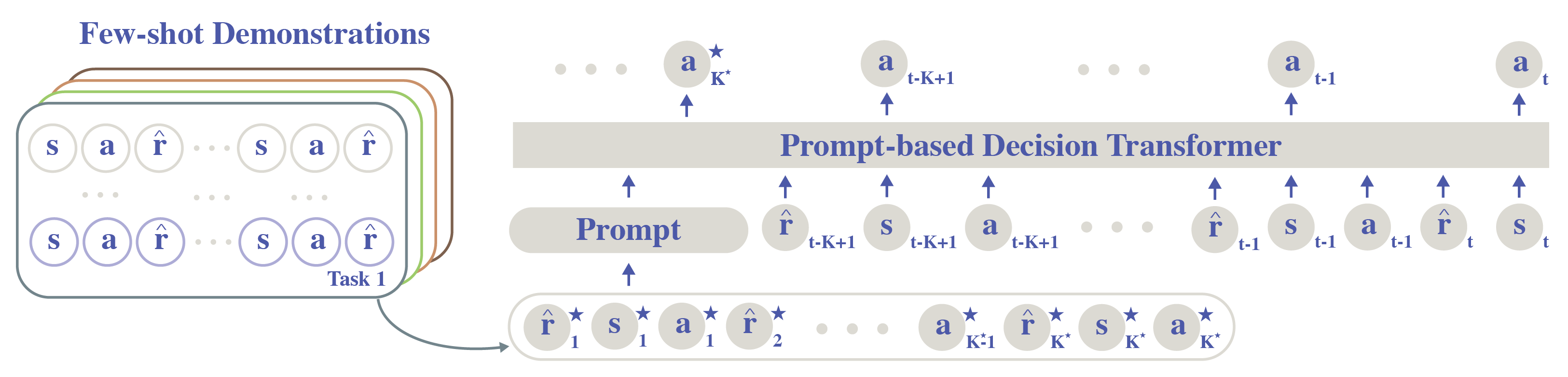 Our Prompt-DT architecture is built on Decision Transformer [Chen et al., 2021] and solves the offline few-shot RL problem through the lens of a prompt-augmented sequence-modeling problem. The proposed trajectory prompt allows minimal architecture change to the Decision Transformer for generalization. For each task at training and testing time, Prompt-DT takes as input both the trajectory prompt obtained from expert demonstrations and the most recent context history. The data pair at each timestep is a 3-tuple (including state, action, and reward-to-go). Prompt-DT autoregressively outputs actions at heads corresponding to state tokens in the input sequence.